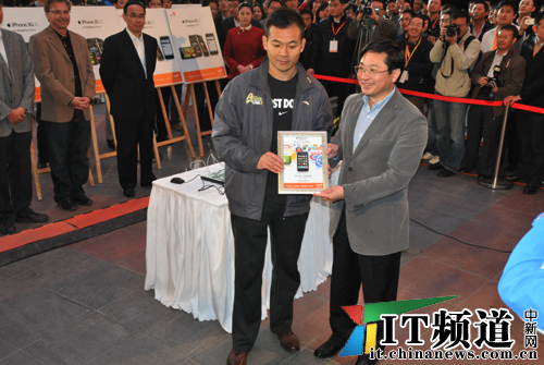 中新網(wǎng)10月30日電 下午6點(diǎn),中國(guó)聯(lián)通iPhone手機(jī)正式在中國(guó)市場(chǎng)發(fā)售。中國(guó)聯(lián)通副總經(jīng)理李剛現(xiàn)場(chǎng)售賣第一臺(tái)iPhone,同時(shí)中國(guó)聯(lián)通高層向現(xiàn)場(chǎng)購(gòu)得手機(jī)的第一位機(jī)主頒發(fā)證書。