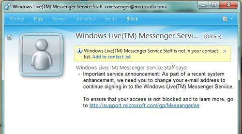這個(gè)消息是從“messenger@”發(fā)出來(lái)的。然而,這個(gè)消息不是要發(fā)給昨天接收即時(shí)消息的用戶(hù)的。Windows Live Messenger團(tuán)隊(duì)已經(jīng)提醒用戶(hù)不要理會(huì)這個(gè)消息。