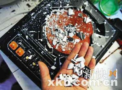 記者來到事發(fā)現(xiàn)場看到,爆炸的電磁爐放在廚房的灶臺上,破碎的磁片散落在電磁爐和地上。電磁爐正上方的抽油煙機(jī)有部分也被炸凹,一個小鍋掉在地上。在廚房外的墻上和地面,留有斑斑血跡,旁邊的鞋架也倒在地上。