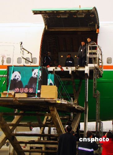 12月23日13時(shí)40分,在“家鄉(xiāng)人”舉行隆重的歡送儀式后,贈(zèng)臺(tái)大熊貓“團(tuán)團(tuán)”“圓圓”登上“熊貓專機(jī)”,臺(tái)灣長榮航空公司波音七四七-四00客貨機(jī)隨后載著它們和贈(zèng)臺(tái)17棵珙桐樹苗飛往寶島臺(tái)灣。