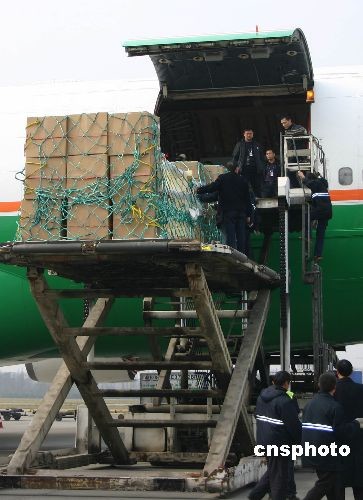 成都雙流國際機(jī)場的工作人員將贈(zèng)臺(tái)17棵珙桐樹苗運(yùn)至專機(jī)貨艙。中新社發(fā) 霍潺 攝