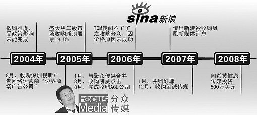 新浪收購分眾傳媒,價格也是一個繞不過去的考量值。兩年前,分眾傳媒股價一度摸高到60美元,那時曾傳言公司將以換股的方式收購新浪。但在進(jìn)入多事之秋的2008年之后,新浪與分眾傳媒的股價表現(xiàn)卻發(fā)生了細(xì)微的變化。新浪的股價一直在30~55美元之間徘徊,而分眾傳媒的股價卻一路下滑,最低甚至觸及6美元。新浪反而更具有抗跌性。