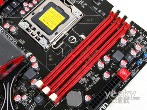 內存支持方面,富士康FLAMING BLADE提供了3條DDR3內存插槽,支持三通道DDR3 1066/1333/1600(超頻模式)內存,最大能夠支持到12GB的內存容量。