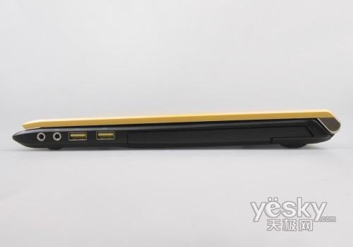 機身右側除了占用空間最大的光驅模塊插槽外,還加入了音頻I/O接口以及一對USB2.0接口,可用于外接USB存儲或控制設備,并為需要輔助供電的設備提供更方便的雙接口設計。