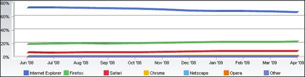 過去12個(gè)月,IE市場份額平均每月下降0.7%。如果按照該趨勢(shì)發(fā)展,2011年5月,IE有望跌破50%。