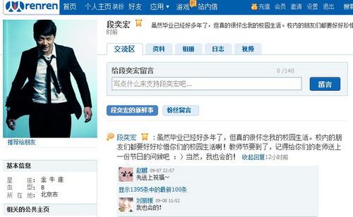 人人網(wǎng)明星主頁(yè)上的眾多明星們:光良、尚雯婕、游鴻明、段奕宏、王寶強(qiáng)等,還有世界小姐張梓琳和王靜瑤以及以那多為代表的新一代年輕作家都紛紛更新自己的狀態(tài)表示對(duì)恩師的問(wèn)候,有的明星還在主頁(yè)上講述自己學(xué)生時(shí)代的趣事,而機(jī)構(gòu)主頁(yè)中的《環(huán)球時(shí)報(bào)》和光線傳媒《最佳現(xiàn)場(chǎng)》等也是在主頁(yè)上更新了教師節(jié)狀態(tài)以此表示對(duì)老師們的敬意。從電話、短信、電子郵件,表達(dá)祝福的方式在不斷演進(jìn),當(dāng)前社交網(wǎng)站因其基于真實(shí)用戶而產(chǎn)生的真實(shí)情感,成為人們表達(dá)祝福的最新選擇。
