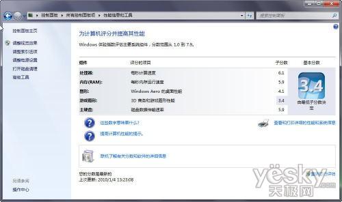 通過Win7檢測(cè)我們能夠很清晰看出Z55整體性能的表現(xiàn),其中處理性能最高,達(dá)到了6.1分,由于配備了4GB內(nèi)存配合64位操作系統(tǒng),內(nèi)存方面的性能也表現(xiàn)出色,達(dá)到了5.9分。另外硬盤部分也表現(xiàn)優(yōu)秀達(dá)到了5.9分。只是3D顯示部分稍顯不足僅為3.4分。不過對(duì)于商務(wù)用戶來說,3D部分在實(shí)際應(yīng)用中并不太多,況且配備9400M獨(dú)立顯卡能夠流暢運(yùn)行目前大部分主流游戲和商務(wù)3D軟件。