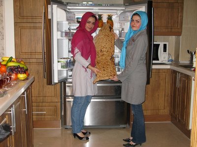 然而,直徑足有60厘米、比臉盆還大一圈的大馕餅在存儲時卻一直困擾著伊朗人。因為出鍋時間一長,馕餅就干得像石頭一樣堅硬,所以當(dāng)?shù)厝司拖氲接盟芰洗饋矸胚M(jìn)冰箱里保存,這樣吃的時候還會柔軟猶如剛出鍋。但這樣又誕生了新的問題,因為傳統(tǒng)冰箱空間局限,巨大的馕餅只能切割成小塊再保存,這樣又會影響到馕餅醇厚彌久的口感。