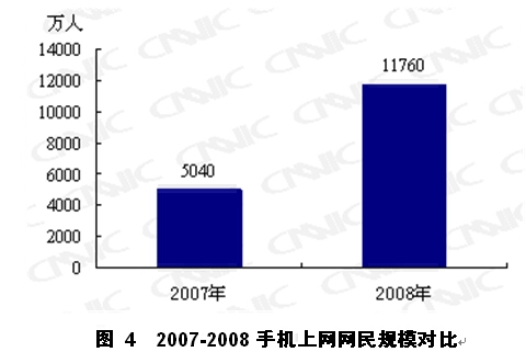 中國互聯(lián)網(wǎng)絡(luò)信息中心(CNNIC)今天下午在京發(fā)布的《第23次中國互聯(lián)網(wǎng)絡(luò)發(fā)展?fàn)顩r統(tǒng)計(jì)報(bào)告》透露,截至2008年,使用手機(jī)上網(wǎng)的網(wǎng)民達(dá)到1.176億人,較2007年增長一倍多。