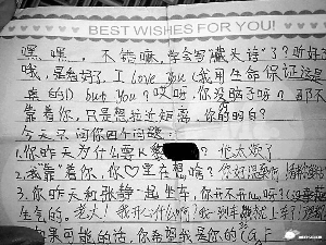 除了一大堆大膽直白的愛語外,最為雷人的是,在其中一張字條中,男生更用英文給女生寫了一首所謂的“藏頭詩”。根據(jù)男生的提示,記者發(fā)現(xiàn),用該組英文對(duì)話每行的最后一個(gè)單詞即可組成“do you love me”一問。而女生則在接下來的字條中甜蜜地回應(yīng)到“不錯(cuò)嘛,學(xué)會(huì)寫‘藏頭詩’了。聽好了,哦,是看好了,I love you(我用生命保證這是真的)”