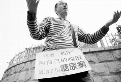 “唾液‘仙丹’”、“用自己的唾液”、“根治2型糖尿病”,連日來,一名30歲左右的男子,背著一個(gè)貼有“根治糖尿病”字樣的挎包,在人民廣場徘徊。他自稱推廣糖尿病的新療法,卻不愿詳述治療原理,在眾人面前做廣告,又不愿透露自己的身份。