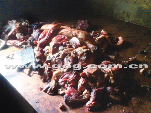 記者昨日(1月13日)在現(xiàn)場看到,一間不大的瓦房內(nèi)掛滿了熏制好的臘肉,約有百余條,地上還有很多松枝燃燒后剩下的灰燼,此臘肉外觀的顏色和市場上所賣的正規(guī)臘肉差不多,但仔細辨認會發(fā)現(xiàn)其還有很多豬毛沒有完全剃掉。緊挨著該加工房的是一間大一點的屋子,其為初加工房,剛走近該屋記者立刻聞到一股酸臭味,制作臘肉的原材料隨意的丟棄在水泥地上,而且部分豬肉已經(jīng)變色發(fā)臭。該屋里還擺放有幾個盆和大桶,里面存放的黑色液體估計是用來腌泡臘肉的醬汁。