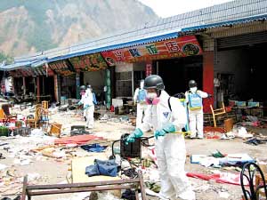 北川縣城是重災(zāi)區(qū),防疫消毒的任務(wù)非常艱巨。在不斷的余震中,廣州檢驗檢疫隊員分成兩組,穿梭在危樓之間噴灑藥物。