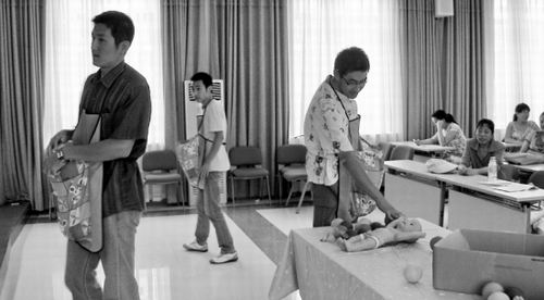 掀開他們的寬大上衣,發(fā)現(xiàn)每一個(gè)人都在肚子上綁上了一個(gè)沙袋,里面裝著5公斤重的沙子,體驗(yàn)著孕婦們?cè)谠挟a(chǎn)期中所需要掌握和學(xué)習(xí)的所有知識(shí),以及因?yàn)閼言卸鴰淼姆N種生活不便。