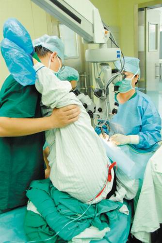 考慮到病人身體的特殊情況,手術(shù)中,醫(yī)生只能始終扛著她的雙腿,并將臀部抬起,才能實施。但是由于拆除白內(nèi)障是十分精密的手術(shù),全過程都要在顯微鏡下進行,負責扛腿的醫(yī)生只要使患者身體有一絲抖動,不僅會使手術(shù)失敗,還可能造成眼球破損,導致終身失明。為此,他們特意安排了多名身體強壯的醫(yī)生,輪流扛著患者腿部。