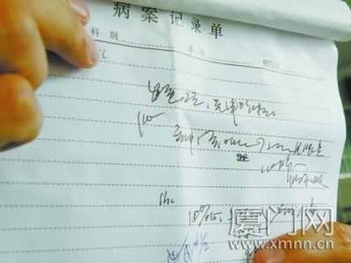 1日下午,在市內(nèi)某大醫(yī)院的兒科候診區(qū),記者隨手向一名帶孩子前來(lái)復(fù)診的家長(zhǎng)借了份病歷,一看就懵了:除了“09.2.1”的日期和表示藥物劑量的幾個(gè)阿拉伯?dāng)?shù)字能看清,其他字跡根本無(wú)法辨認(rèn)。“醫(yī)生寫(xiě)字都是這樣!边@位家長(zhǎng)說(shuō),他從來(lái)就不去看病歷,看了也看不懂。