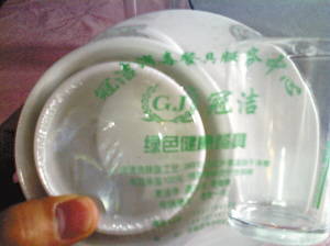 這兩家產品一個名叫“冠潔”,一個名叫“天康”。飯店老板告訴記者,名為“冠潔”的餐具是最近才進入市場的,而名叫“天康”的餐具則已經有了一段時間。“冠潔餐具的老板是我們礦區(qū)衛(wèi)生局長的丈夫,他親自登門推銷,我們也不敢說什么,只好用一些!
