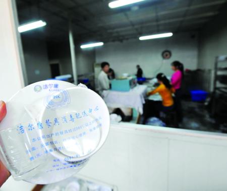 “這些餐具你們自己用不用?”面對工商執(zhí)法人員的詢問,一名正在清洗“消毒餐具”的女工沉默半晌后搖了搖頭,小聲地說:“我不用!27日中午,接到記者反映的情況后,工商部門查處了位于福州晉安區(qū)譚橋村的這家消毒餐具廠。記者看到,這家廠的餐具包裝袋上印著“潔爾康餐具消毒配送中心”字樣。
