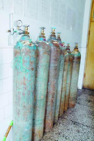尉氏縣一些群眾向記者反映,尉氏縣第二人民醫(yī)院繼續(xù)使用工業(yè)氧冒充醫(yī)用氧。昨天上午,記者來到該院病房樓一樓內(nèi)科住院部,在一個標注有搶救室的房間里,放著7個氧氣鋼瓶,沒有醫(yī)用氧氣合格證、沒有藥品批準文號、沒有生產(chǎn)日期,甚至鋼瓶上沒有氧氣生產(chǎn)廠家的名字。有的鋼瓶上的檢驗標志注明使用時間為2004年至2007年。一個鋼瓶上還裝著吸入器,病房內(nèi)的患者告訴記者,患者吸的就是鋼瓶內(nèi)的氧氣。