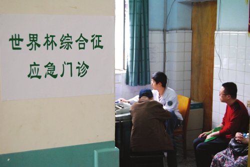 昨日上午,成都市第三人民醫(yī)院急診科主任魏鳴將印有“世界杯綜合征應急門診”門牌貼在急診內科門口。從今天開始,這個應急門診將24小時為球迷們服務。9名醫(yī)生中除了一名女醫(yī)生,其他的人全是球迷。門診沒有安裝電視,對于球迷醫(yī)生來說,值班的晚上也是痛苦的煎熬。