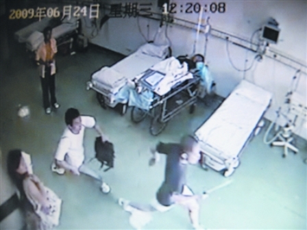 監(jiān)控錄像中顯示:一名光頭男子逃進(jìn)搶救室,兩名男子持刀一路追砍(見圖),在搶救室一角將其砍成血人才罷休。行兇幾分鐘后,6名砍人兇徒從容走出醫(yī)院,沿香江花園路口向三眼橋方向逃走。傷者隨即被送進(jìn)十一醫(yī)院手術(shù)室,搶救后一人傷勢(shì)嚴(yán)重被轉(zhuǎn)往協(xié)和醫(yī)院治療。