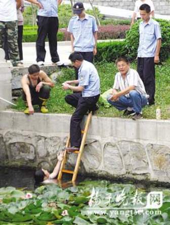 女子與眾人僵持了半個(gè)小時(shí)后,一位民警無意中與其提到“錢”,該女子突然表現(xiàn)出極大的興趣:“你給我錢,我就上去。”民警掏出兩張百元大鈔在岸上晃了晃,哄道:“先上來,上來我就給你!痹诒娙说膭裾f和鈔票的吸引下,該女子終于同意穿上衣服上岸。在上岸之前,她還從河中摘了一朵蓮花獻(xiàn)給警察,以示“感謝”。據(jù)悉,該女子姓孫,35歲,11年前,因戀愛問題,患上狂躁癥,先后多次被送到精神病院治療。(紹平 萬春 李根 小川)