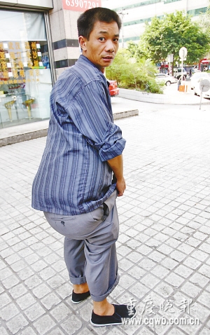 來(lái)自四川鄰水的郭遷安身高僅1.6米,體重卻有85公斤,其中,有40公斤是腫瘤。昨天,記者看到,郭遷安腰間的大腫瘤墜到臀部以下,活像衣服里藏了包東西。