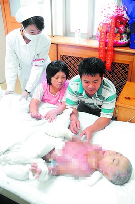 醫(yī)生告訴雷麗娟,孩子75%面積燒傷,無法痊愈,“你們花100萬也治不好,就算治好也有可能落下殘疾!崩惥耆套⌒闹械谋矗瑩崦凝埳砩现刂匕陌准啿颊f:“不管你變成什么樣,永遠(yuǎn)都是媽媽的寶貝!就算上街乞討,也要把你治好!”第二天,雷麗娟和丈夫帶著孩子先后來到長沙的4所醫(yī)院,但求醫(yī)未果。今年8月中旬,經(jīng)人介紹,孩子被送進解放軍163醫(yī)院燒傷整形·頜面外科中心,醫(yī)生確診其為“全身燒傷后疤痕攣縮畸形”。
