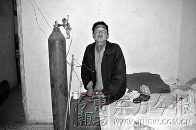 和記者聊了一會(huì)兒,吳乃學(xué)咳嗽了一陣子,他探起身,拄著竹竿往屋內(nèi)走,記者不明白他干什么,跟了進(jìn)去。原來(lái),他的臥室床頭前,放著一個(gè)大氧氣瓶,他剛才感覺到了呼吸困難,進(jìn)屋吸了幾口氧氣,臉上又是一陣通紅。