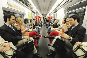 日前,15對(duì)同卵雙胞胎按照亞當(dāng)斯的要求,一起在紐約市布魯克林橋的地鐵站碰頭,15對(duì)同卵雙胞胎走進(jìn)地鐵車(chē)廂后,每對(duì)雙胞胎都排著隊(duì)各自坐在了過(guò)道兩側(cè)的座位上,并且每個(gè)雙胞胎要直接面對(duì)著自己的雙胞胎兄弟或姐妹。當(dāng)15對(duì)雙胞胎“各就各位”后,他們接下來(lái)要做的事就是盡可能保持動(dòng)作一致,如果一個(gè)雙胞胎用手撓頭,那么他的同卵雙胞胎也必須用手撓頭;一個(gè)雙胞胎看報(bào)紙,他的同卵雙胞胎也必須低頭看報(bào)紙。總之,他們就好像是對(duì)方的“鏡中影像”一樣。這些同卵雙胞胎還被告知,如果有乘客詢問(wèn)他們到底發(fā)生了什么事,他們要表現(xiàn)得一無(wú)所知,甚至好像壓根沒(méi)看到坐在自己對(duì)面的同卵雙胞胎一樣。