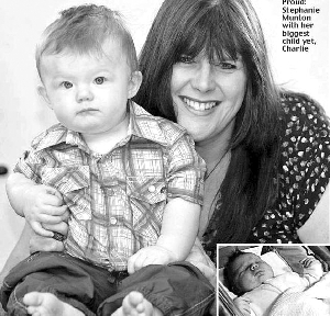 英國西約克郡彭特弗萊克市41歲女教師斯蒂芬妮·蒙頓16年前生下第一個女兒安布時,她以為自己生下了一個“巨嬰”,因為安布生下來竟重達9.6斤。然而令斯蒂芬妮做夢也沒想到的是,她又接連生下了另外3個兒女,并且這些孩子就像暗暗較勁一樣,出生時一個比一個重,斯蒂芬妮最小的孩子、如今7個月大的查利出生時竟重達12斤!斯蒂芬妮發(fā)誓以后再也不敢懷孕了,因為她無法想象如果自己再生第5個孩子,這個孩子的體重將會多驚人。