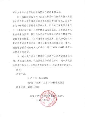 一、16日接到國(guó)家質(zhì)檢總局通知伊利集團(tuán)一款兒童奶粉含有三聚氰胺后,伊利集團(tuán)在第一時(shí)間內(nèi)將市場(chǎng)該批次產(chǎn)品已全部回收,目前市場(chǎng)上已沒(méi)有該批次產(chǎn)品銷(xiāo)售。給消費(fèi)者帶來(lái)的影響我們深表歉意。