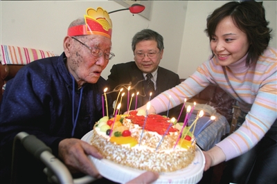“一,二,三,吹……”長壽肝癌患者王會川笑呵呵地接受眾人的祝福。昨天,在老人位于玉蜓橋附近的家中,北京中醫(yī)藥大學東方醫(yī)院的醫(yī)護人員為他提前慶祝生日。