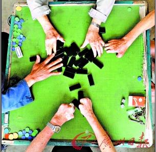 下午1時(shí)多,馬曲頭還沒(méi)有開(kāi)始生火煮粥,而不遠(yuǎn)處則傳來(lái)麻將的聲音,那里是個(gè)娛樂(lè)室,面積不大,只有10多個(gè)平方米,擺了兩桌麻將,一桌牌九。推牌九的其中一位老人已90歲了,但他氣色不錯(cuò),頭腦也清醒。4個(gè)老人用殘破的雙手玩牌。