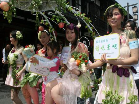 當(dāng)天正值第四十個(gè)世界地球日,成都文殊坊街上人流熙攘。這幫身披菜葉的年輕漂亮女子馬上就成為行人注目的焦點(diǎn),“喲,遠(yuǎn)看就只掛了些菜葉子在身上,原來還是穿了點(diǎn)紗的嘛,是不是又在搞什么商業(yè)活動(dòng)哦?”四川新聞網(wǎng)記者在現(xiàn)場看到,雖然沒怎么搞清楚狀況,但不少市民已經(jīng)掏出手機(jī)來開始拍照。得知是群素食主義者的宣傳活動(dòng)后不少市民都打趣稱,“用穿得少的美女上街當(dāng)噱頭,肯定要轟動(dòng)!