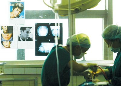 昨日,某醫(yī)院,香港明星吳彥祖的海報(bào)貼在窗戶上,醫(yī)生正為王先生做手術(shù)記者 鄒飛 攝“顴骨千萬(wàn)不要凹陷!盡可能讓臉窄!”昨日,本市某醫(yī)院整形科,一名高大、帥氣的男子持4張香港明星吳彥祖的海報(bào),要求整成吳彥祖的樣子。據(jù)整形科吳主任介紹,本月已有兩個(gè)帥哥來(lái)醫(yī)院要求整成吳彥祖。