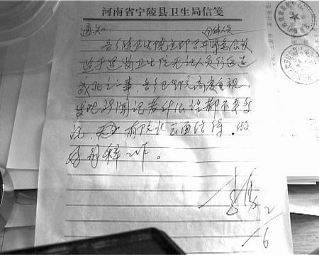 “寧陵縣邏崗鎮(zhèn)衛(wèi)生院沒有行醫(yī)資格的醫(yī)生給我兒媳接生,導(dǎo)致胎死腹中。”6月1日,商丘市民權(quán)縣伯黨鄉(xiāng)村民郭漢章打來熱線反映。而記者在采訪中,卻意外地發(fā)現(xiàn)一份該縣衛(wèi)生局長簽名的通知,要求:“各鄉(xiāng)衛(wèi)生院高度重視,發(fā)現(xiàn)新聞記者,什么話都不要多說……”(如左圖)據(jù)郭漢章介紹,5月1日傍晚,兒媳趙婭君感到腹部陣痛,家人立即將其送入寧陵縣邏崗鎮(zhèn)衛(wèi)生院檢查!爱(dāng)晚做B超檢查時(shí),醫(yī)生說胎音、羊水一切正常。第二天早上6點(diǎn),醫(yī)生王美英叫來一個(gè)人,一起將兒媳送進(jìn)產(chǎn)房后,兩個(gè)人不停地在兒媳腹部擠壓,一個(gè)半小時(shí)后,趙婭君全身顫抖,面色異常。做了檢查后,證實(shí)其腹中胎兒已經(jīng)死亡!