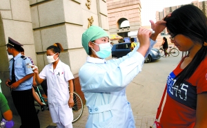 昨日,該校各個大門都有保安值守,檢查進(jìn)出人員的證件,并對入校人員進(jìn)行體溫檢測。一份23日發(fā)布的緊急通知稱:根據(jù)學(xué)校甲型H1N1流感形勢及上級防控特殊要求,開學(xué)第一周確定為甲流緊急防控期,教職工、學(xué)生必須體溫檢查。