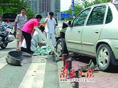 車禍現(xiàn)場對面某玉器檔主稱,當時一名30多歲的孕婦正在安全島靠近交通燈處等候過馬路,這時銀色小轎車失控沖破護欄直奔孕婦。“小轎車急剎都來不及,重重地撞在孕婦身上,連她后面的交通燈柱都撞歪了。她被夾在小車與燈柱之間,滿臉是血!薄霸袐D穿著淡黃色衣服,肚子鼓鼓的,估計懷孕七八月了。被撞后她尖叫一聲,還大喊‘這樣都能撞到’,隨后就不省人事!眹^的市民說,救護車趕到后,醫(yī)護人員將孕婦抬出,當場在地上急救,孕婦的丈夫在旁邊悲傷痛哭。20分鐘后,孕婦被抬上救護車送院。11時左右,小轎車被拖走。
