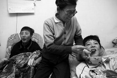 今年71歲的鞠阿姨是從部隊退休的老教師,老伴兒也是部隊的老干部,他們的兩個女兒都患有先天性腦癱,生活不能自理。多年來,老人一直悉心照顧著一對女兒。2000年老伴兒去世,此后鞠阿姨一個人照顧著兩個女兒,F(xiàn)如今,鞠阿姨每天都堅持鍛煉,就是希望自己能多活幾年好照顧女兒。