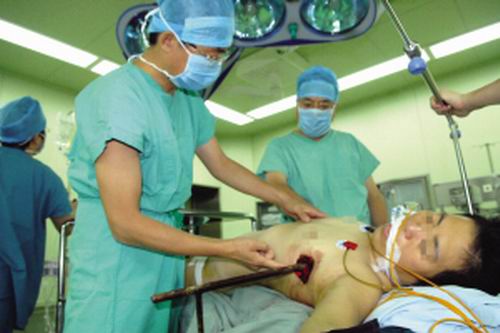 來(lái)到醫(yī)院后王女士已經(jīng)出現(xiàn)意識(shí)模糊,同時(shí)伴有劇烈的胸痛。胸外科主任張臨友教授和副主任徐廣全教授迅速組織相關(guān)科室人員會(huì)診,爭(zhēng)取快速摸清患者胸腔內(nèi)的情況和鋼筋對(duì)各器官造成的損傷。由于消防隊(duì)員在切割鋼筋時(shí)怕傷到王女士,所以切割點(diǎn)離傷口較遠(yuǎn),造成留在體外的鋼筋較長(zhǎng),傷者無(wú)法進(jìn)入CT拍攝影像,給診斷帶來(lái)了很大的困難。醫(yī)生只得為王女士進(jìn)行了胸部的X光片檢查。依靠豐富的臨床經(jīng)驗(yàn)和X光片,醫(yī)生判斷王女士的肺組織已經(jīng)損傷,必須立即開胸探查。