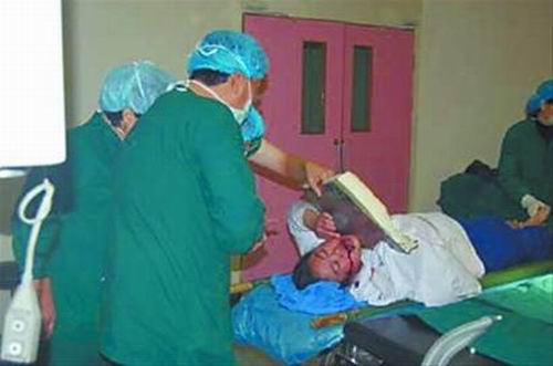 8時多,剛到醫(yī)院的張紅立刻被推上手術臺。“我從醫(yī)17年,還是頭一次見到這樣的病例!笨谇豢浦魅问Y衛(wèi)東說:“門把手就像個十七八厘米長的大魚鉤,把她整個鉤住了,腦袋掛在把手上,好在把手是光滑的、鈍的,沒有刺到后顱腦,要不,誰也拿不下來”。