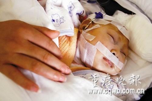 今年9月21日,“何李花”在萬(wàn)州出生。與醫(yī)生預(yù)料的一樣,小花患有先天性腦膜膨出,頭上的腫瘤比正常的頭還大。這時(shí),親人們才知道,李壽英沒(méi)有聽(tīng)從醫(yī)生的建議,生下有嚴(yán)重畸形的寶寶。