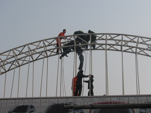 12月18日上午,許昌市一男子因100元工資糾紛,竟然攜帶汽油爬到位于市區(qū)解放路與許繼大道交叉口的鐵路立交橋附近一座十六七米高的廣告架上欲跳塔自焚,在勸說(shuō)無(wú)果后,該男子飲下隨身攜帶的汽油后全身抽搐掛在半空中!關(guān)鍵時(shí)刻,數(shù)10名消防官兵一擁而上,成功將其從廣告架上救下送往醫(yī)院搶救。