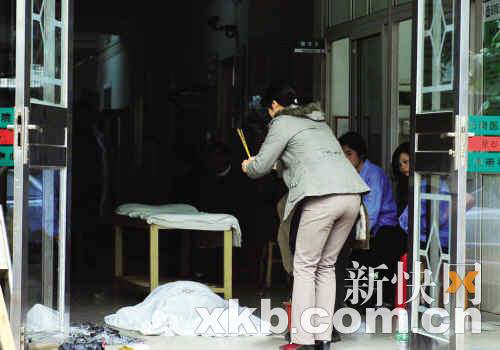前日上午11時,記者在事發(fā)醫(yī)院看到,醫(yī)院門口拉起警戒線,兩名警察在維持秩序。醫(yī)院樓前堆放著一些桌椅,門前撒了一地紙屑。門診大廳的過道上聽放著死者遺體,一名婦女在旁焚紙燒香,廳內(nèi)還有不少人聚集,哭聲陣陣。