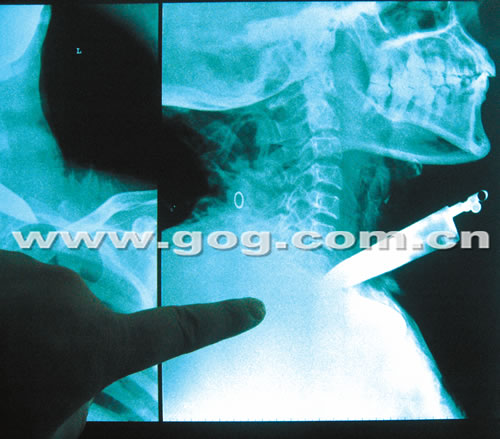 貴醫(yī)附院耳鼻喉科主治醫(yī)生王曉云告訴記者,老人被送到醫(yī)院時(shí),喉嚨上插著一把水果刀,進(jìn)入喉嚨的刀鋒部分大約有6.5公分。王曉云說:“經(jīng)檢查,老人頸部和肺尖受傷,生命垂危。由于水果刀可能傷到大動(dòng)脈,手術(shù)有風(fēng)險(xiǎn),要求家屬簽字,但老人一直不透露家人的信息,我們醫(yī)院也很為難!
