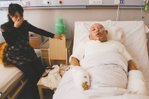 昨日,記者在吉林省武警醫(yī)院見到了來自公主嶺市陶家屯鎮(zhèn)久勝村6社41歲的劉國(guó)軍。他的頭部、面部都抹滿了藥膏,上半身及雙手都裹著厚厚的紗布,好在還神志清醒。