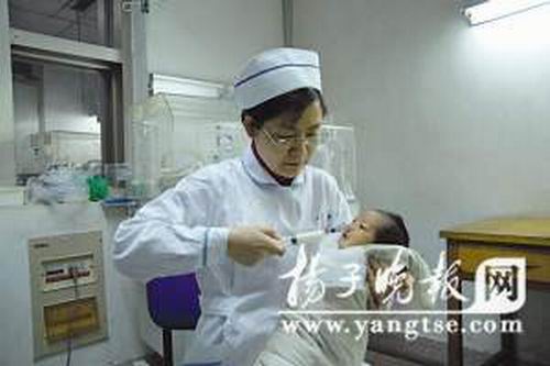 4日上午,記者來到儀征市人民醫(yī)院婦產(chǎn)科,只見朱汝成護(hù)士長(zhǎng)正在用針管小心翼翼地給“小牛娃”喂奶。由于小家伙鼻腔和口腔相通,不能自己喝奶,每次只能用針管,還要小心謹(jǐn)慎,生怕嗆著孩子。記者注意到,“小牛娃”用依戀的眼神看著護(hù)士長(zhǎng),朱護(hù)士長(zhǎng)說,每次看見小孩子的眼神,心里特別難過,自己也是母親,知道這么個(gè)小生命實(shí)在太脆弱了,F(xiàn)在自己照顧他,就把他當(dāng)成自己的孩子,孩子是無(wú)辜的,他也是一個(gè)小生命!靶∨M蕖背酝昴毯,朱護(hù)士長(zhǎng)又把他放進(jìn)幼兒床里,因?yàn)榕滦〖一镏鴽,辦公室的空調(diào)始終開著,從正月初三起,婦產(chǎn)科全體醫(yī)護(hù)人員輪流照顧孩子,并給孩子購(gòu)買奶粉、衣服、尿不濕等必需品。