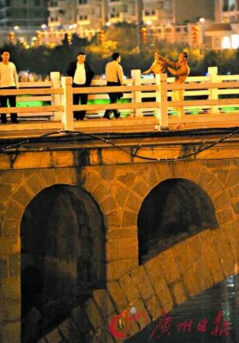 前晚,記者在事發(fā)現(xiàn)場(chǎng)看到,一個(gè)上身赤裸的男子情緒十分激動(dòng),一手“提”著小孩的腳,一手揮舞水果刀,站在橋欄旁將小孩甩來(lái)甩去,并時(shí)而將小孩“伸”出橋欄外。現(xiàn)場(chǎng)民警一邊與持刀男子展開(kāi)對(duì)話(huà),勸說(shuō)其不要傷害小孩,一邊派熟悉水性的民警駕船到新豐江河中,以防萬(wàn)一。20多分鐘后,經(jīng)當(dāng)?shù)孛窬托膭裾f(shuō),該男子終于扔掉手中的水果刀,民警迅速包圍該男子將其擒住。(曾煥陽(yáng) 李燕南 黃贊福)