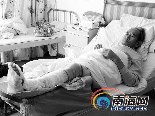 3日下午,記者在海南邊防醫(yī)院見(jiàn)到了受傷的張老漢。老人躺在病床上,左腳纏了繃帶并用木板固定住。張老漢回憶說(shuō),1日下午4點(diǎn)左右,他在博愛(ài)南路過(guò)馬路,打算去附近的東湖站臺(tái)乘坐剛到站的36路公交車。這時(shí),一輛開(kāi)往博愛(ài)南路方向的摩托車緊貼著他的身子急速行駛過(guò)來(lái)。摩托車后輪的輻條將他的左腳“拐”進(jìn)車輪內(nèi),他覺(jué)得一陣鉆心的疼痛!爸,我被拖行了2米多,摩托車才停了下來(lái),我趁機(jī)將腳抽出來(lái),司機(jī)卻開(kāi)著車跑了”。張老漢氣憤地說(shuō)。